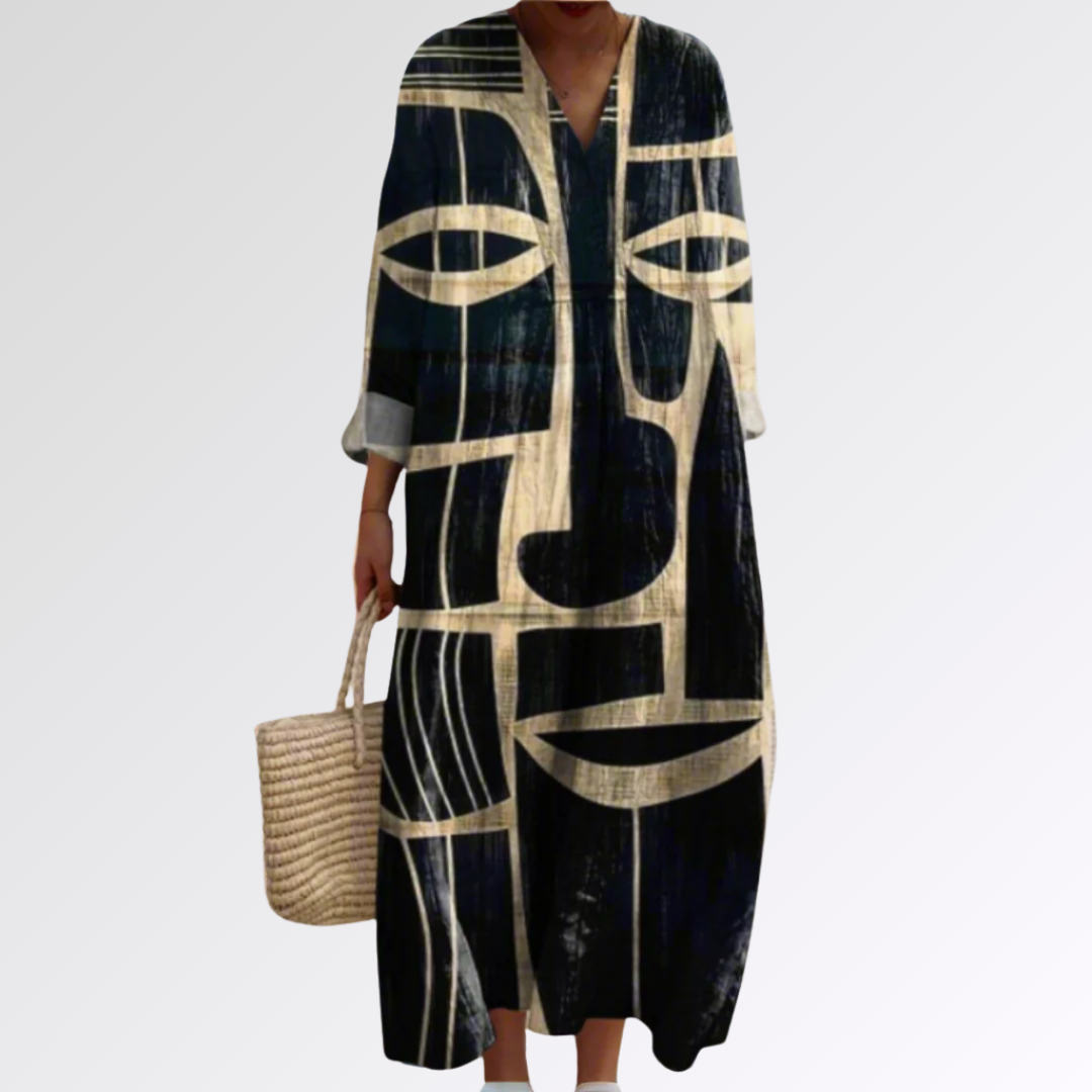 Avec son imprimé de visage abstrait en lignes ivoire sur fond bleu nuit, la robe Ismène s’impose comme une œuvre d’art à part entière. Minimaliste et percutante, elle célèbre les formes, les regards et le silence du textile.