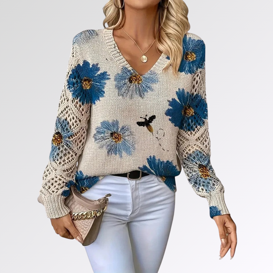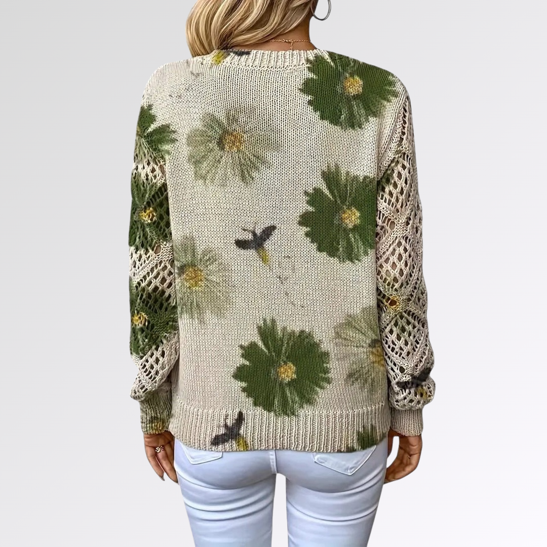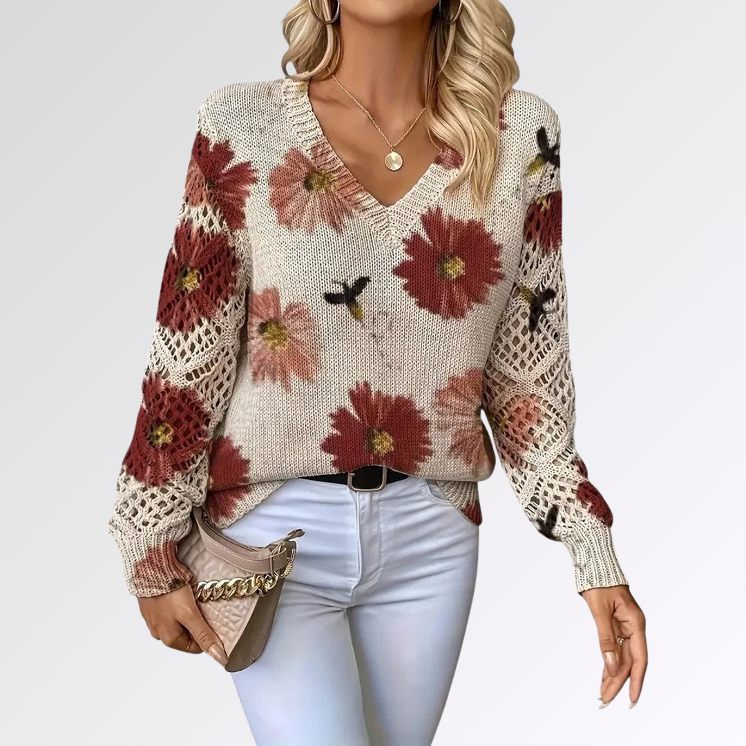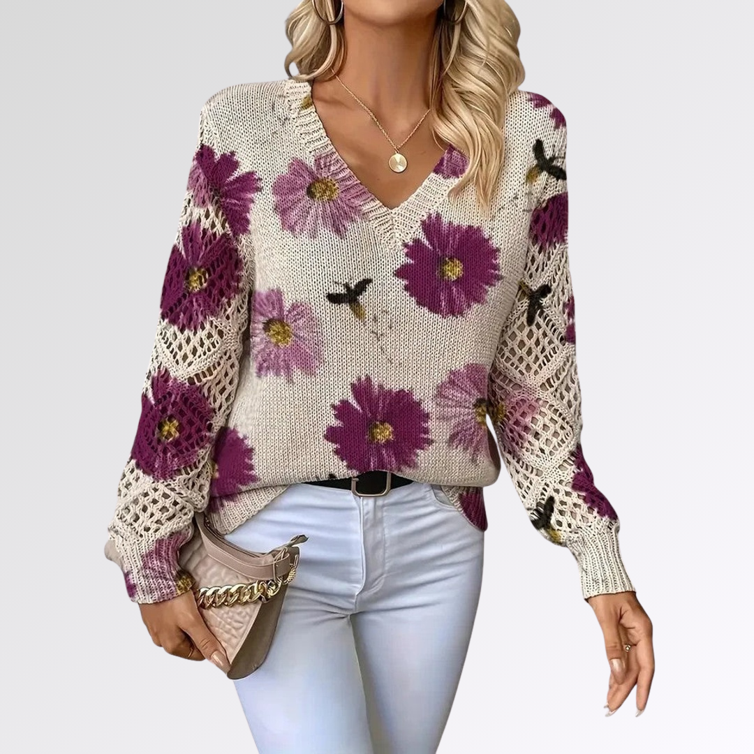 Maille à encolure en V orné d’un motif floral audacieux. Détails ajourés sur les manches pour une touche de légèreté et de charme. Sa coupe fluide apporte un équilibre parfait entre élégance et décontraction.